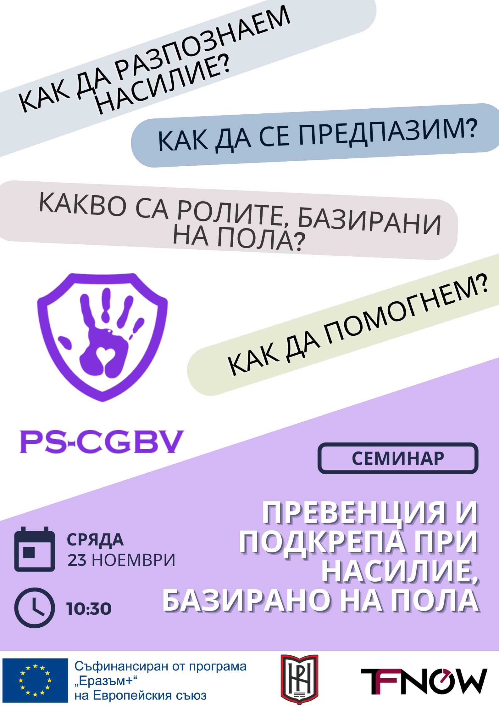 На 23.11.2022 г. (сряда) от 10:30 ч. в зала 114 (Учебен корпус № 1) ще се проведе семинар на тема „Превенция и подкрепа при насилие, базирано на пола“.